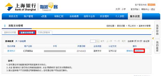 4. 在直聯支付管理中選擇匯添富基金,點擊“限額修改”