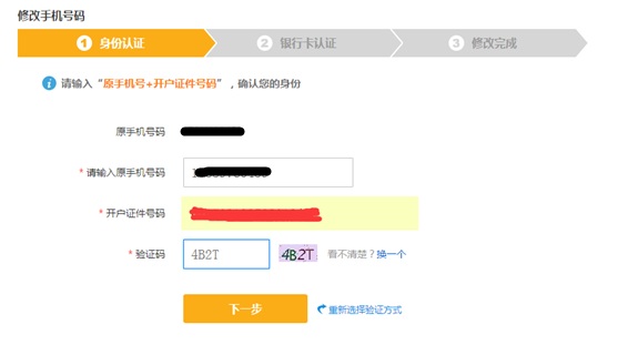 第三步:輸入原手機號碼及開戶證件號碼、驗證碼,點擊“下一步”