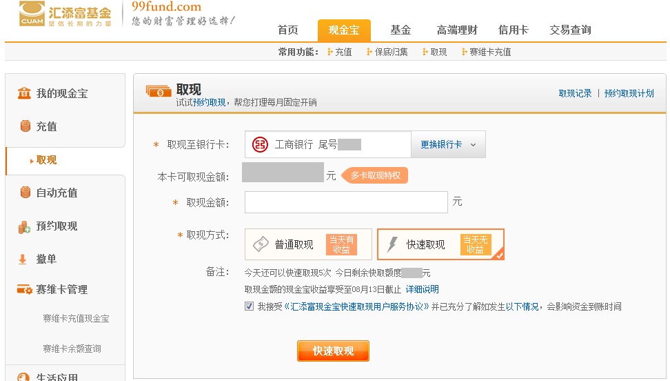 3、 進入取現預覽頁面后,選擇“快速取現”