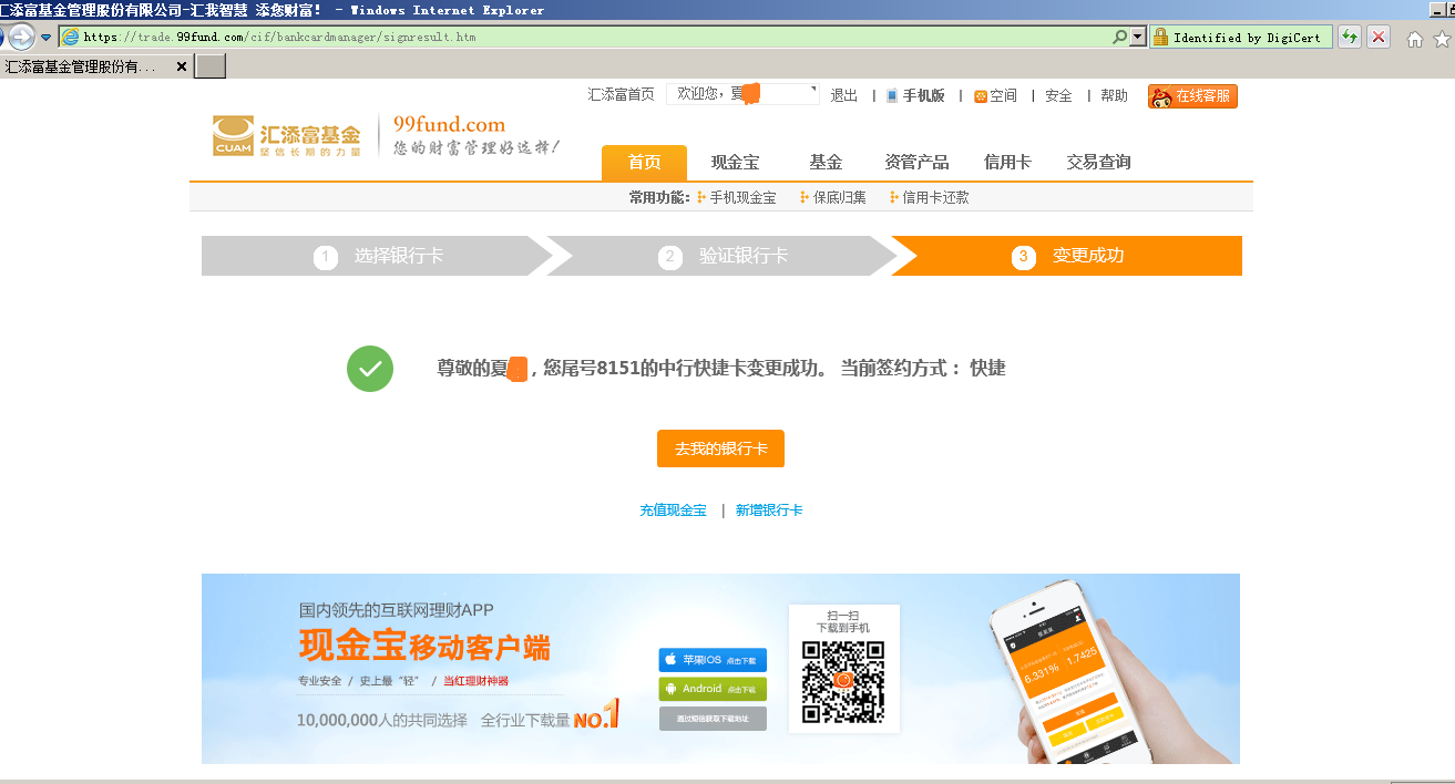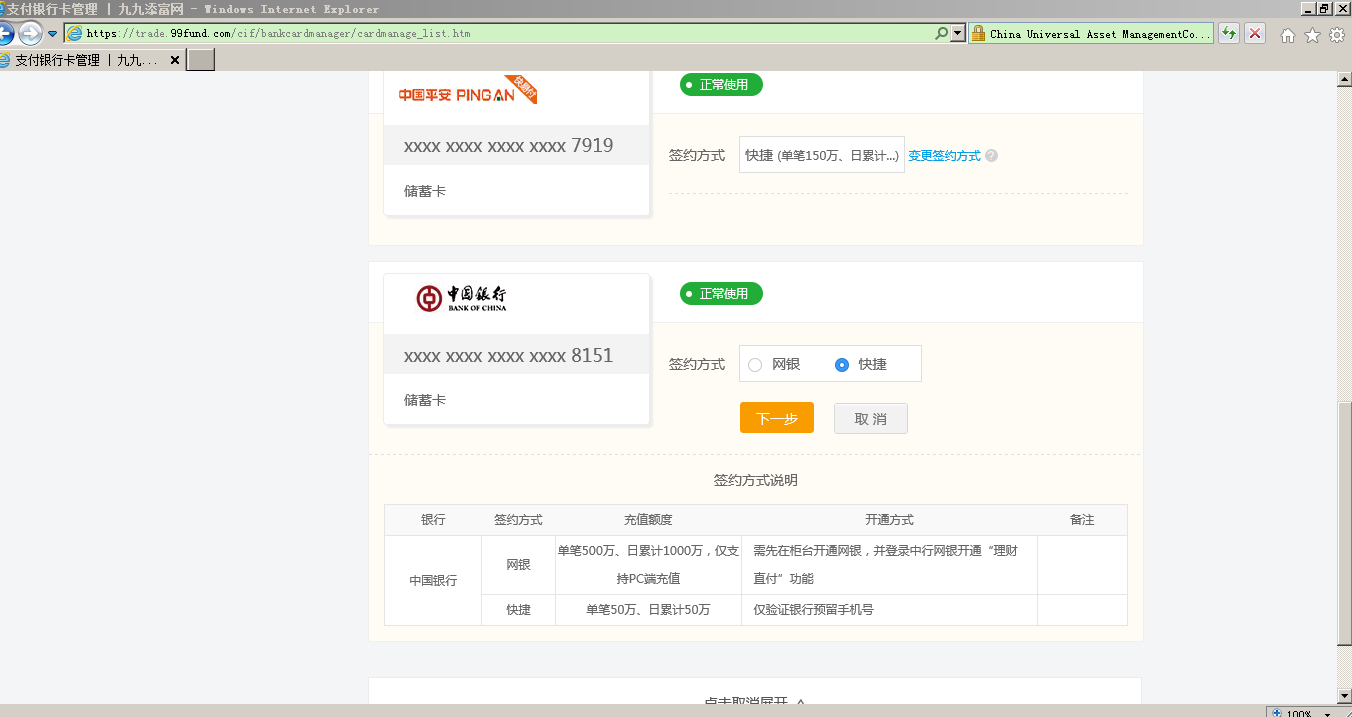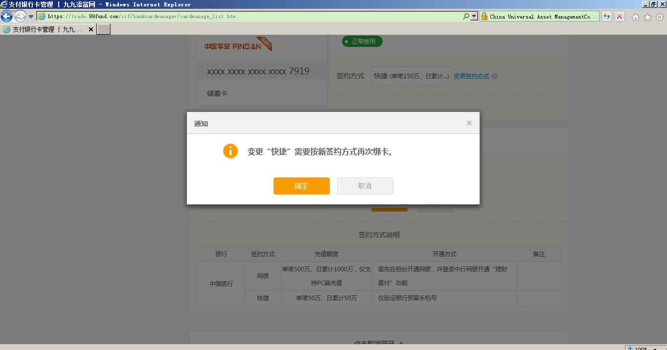 第一步 (App不支持操作)通過匯添富官網(m.9fanli.com)網頁登錄現金寶賬戶,點擊“首頁”-“銀行卡管理”,點擊“變更簽約方式” ,選擇“快捷”模式