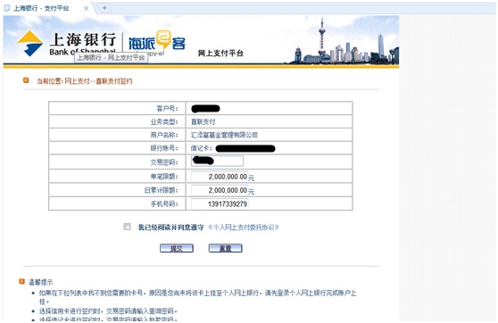 3.2 填寫直聯(lián)支付簽約信息,包括交易密碼、支付限額等信息,簽署《個(gè)人網(wǎng)上支付委托協(xié)議》,點(diǎn)擊“提交”;