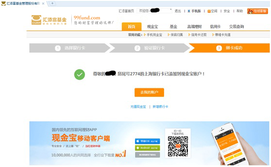 3.4 回到匯添富網(wǎng)站頁面。提示綁卡成功。