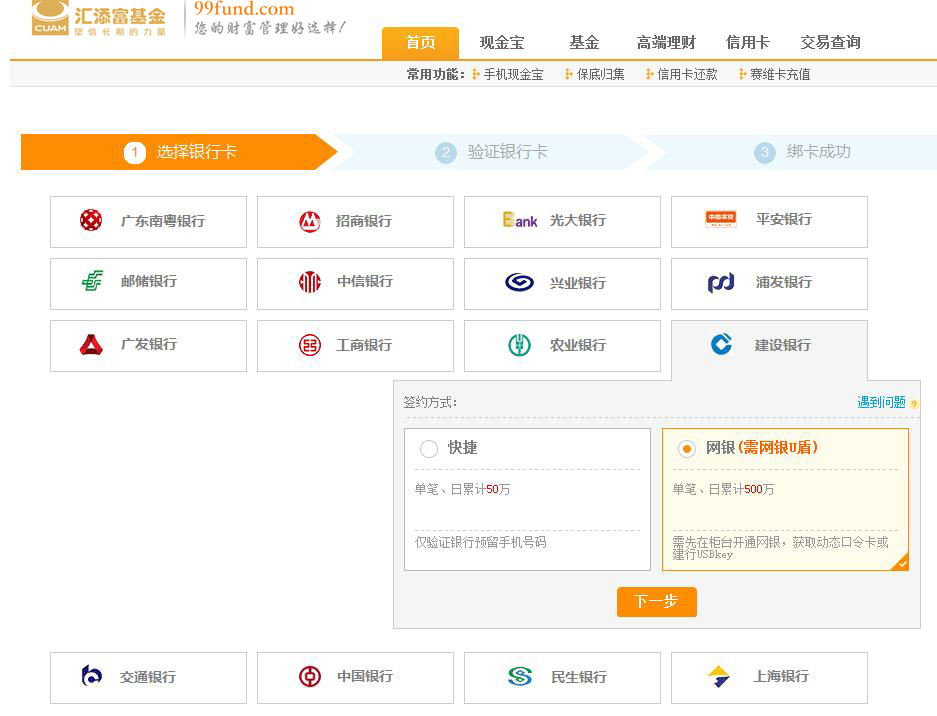 第一步 登陸匯添富官網網頁賬戶,點擊“首頁”-“銀行卡管理”,選擇“添加銀行卡”