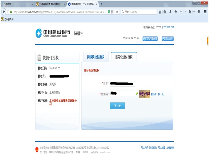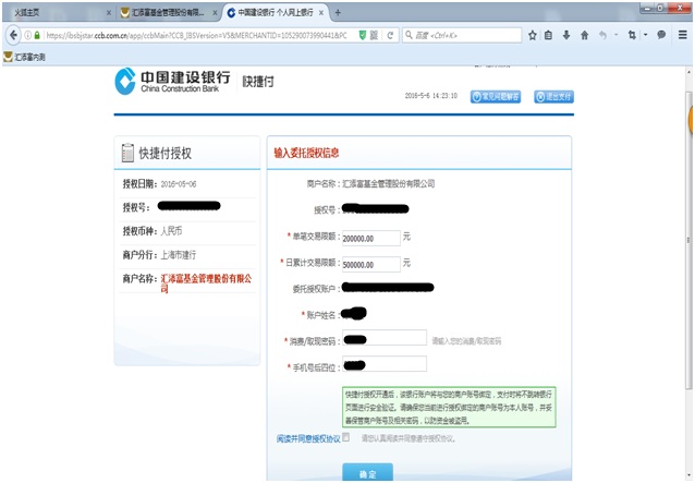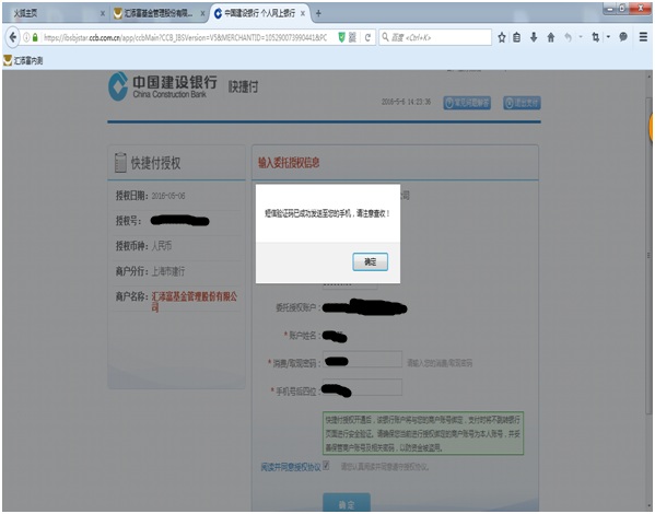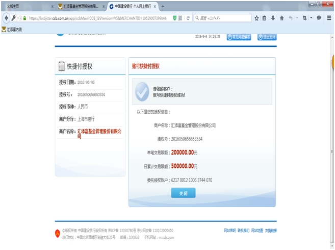 3.7 建行網銀快捷付授權成功,點擊"關閉"后,返回匯添富網上交易系統注冊頁面;