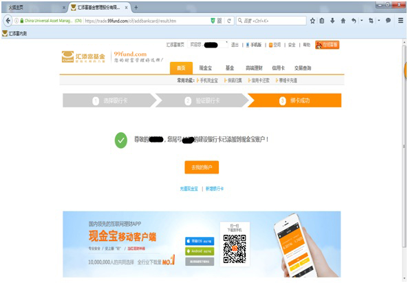 3.8 回到匯添富網站頁面。提示綁卡成功。