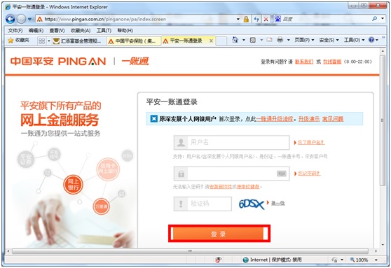 2. 輸入平安一賬通的用戶名、密碼、驗證碼后點擊“登錄”按鈕
