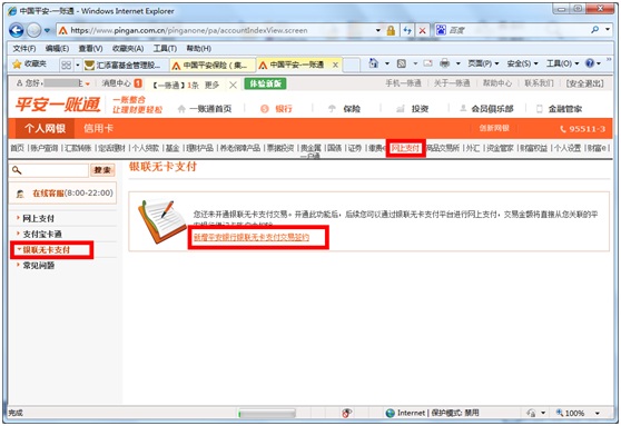 4. 在個人網(wǎng)銀頁面,點擊“網(wǎng)上支付”-“銀聯(lián)無卡支付”,點擊“新增平安銀行銀聯(lián)無卡支付交易簽約”