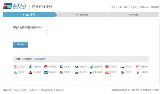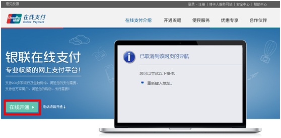 1. 登錄銀聯在線支付網站(https://static.95516.com/static/open/index.html),點擊“在線開通”